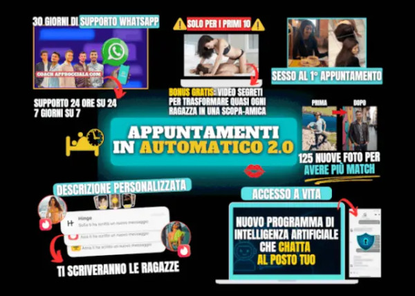 • Ti liberi dalla paura del rifiuto e dell’ansia d’approccio. Inizierai ad ottenere i primi appuntamenti e serate piccanti grazie alle app di incontri e l’intelligenza artificiale che gestirà la parte difficile al posto tuo.